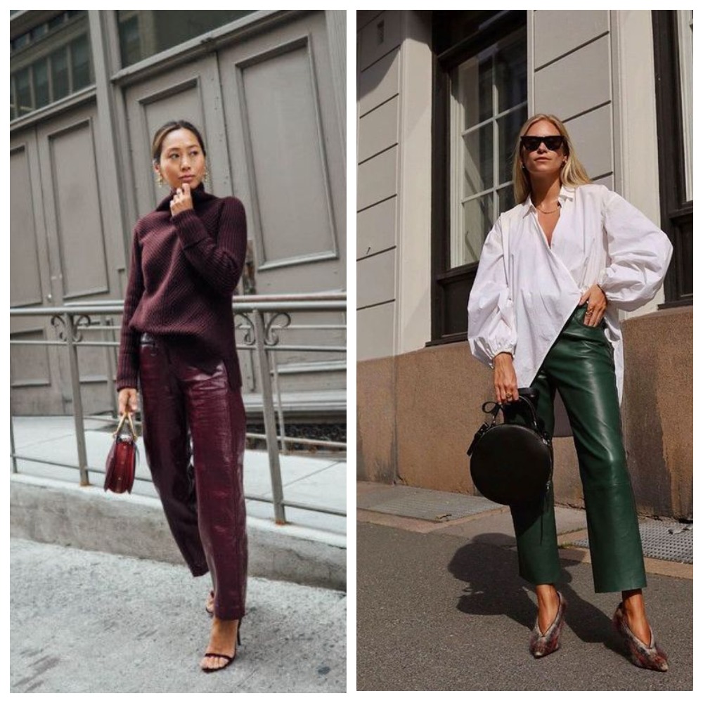 А вот со слишком яркими оттенками кожаных брюк нужно быть осторожнее. Как я уже говорила, этот предмет гардероба и так довольно акцентный, не стоит дополнительно нагружать его сложным цветом.